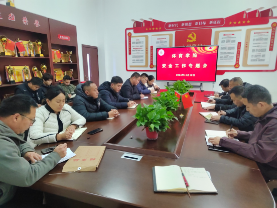 11月19日下午,体育学院在一楼党员活动室召开安全工作专题会,深入学习贯彻习近平总书记关于安全稳定工作的重要指示批示精神,进一步分析当前校园安全形势,安排部署近期安全工作任务。班子成员、教研室主任和辅导员参会,会议由范伟杰主持。